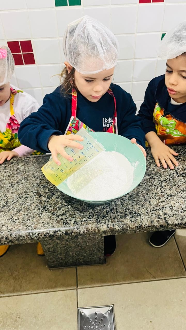 Inspirada nas tradições brasileiras e na rica culinária da região Sudeste, a professora Liliane convidou as crianças para uma deliciosa experiência: preparar a receita do tradicional pão de queijo. Durante a vivência, os pequenos exploraram ingredientes, texturas e cheiros, vivenciando de forma lúdica e significativa a cultura alimentar da nossa região!