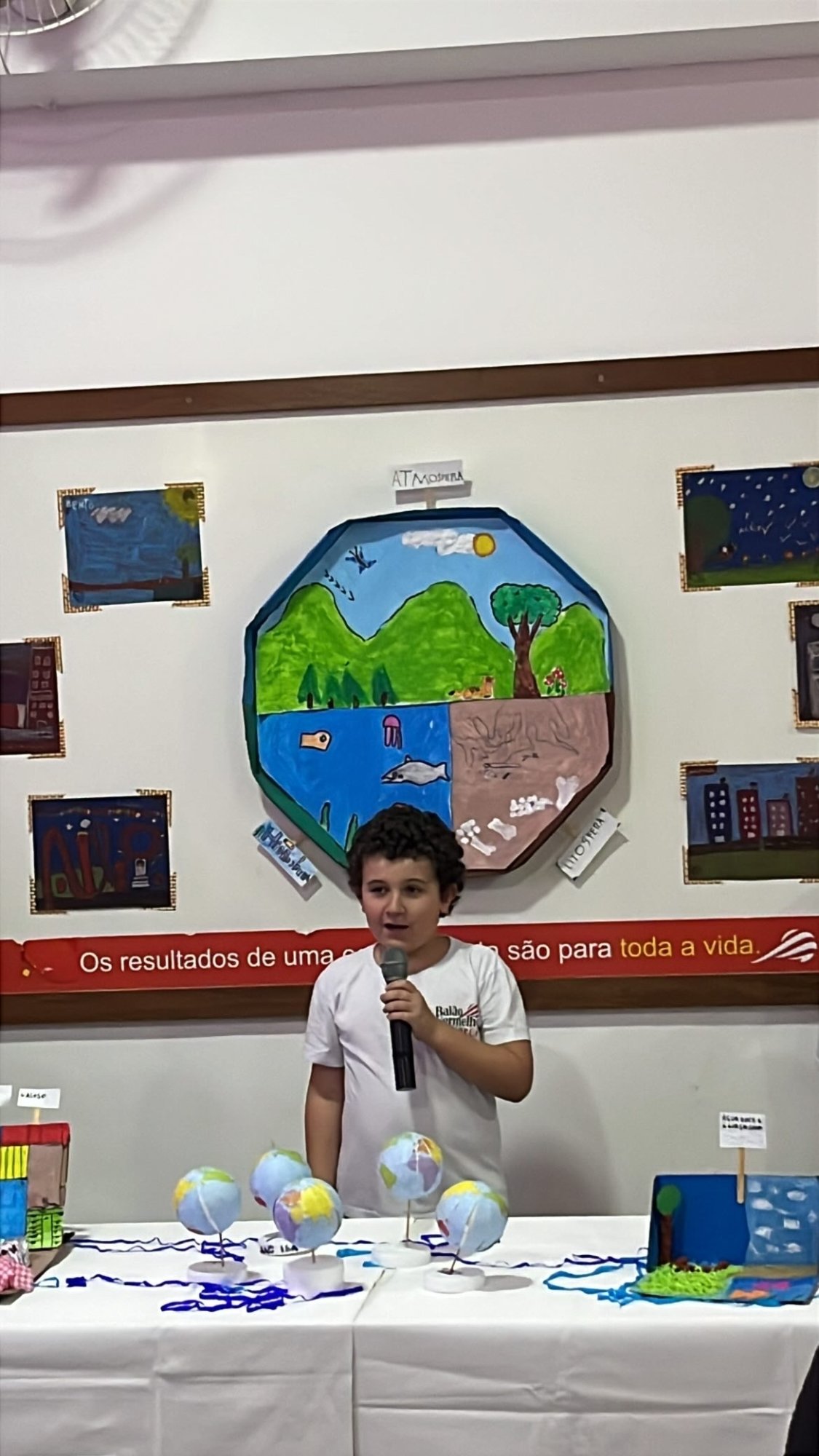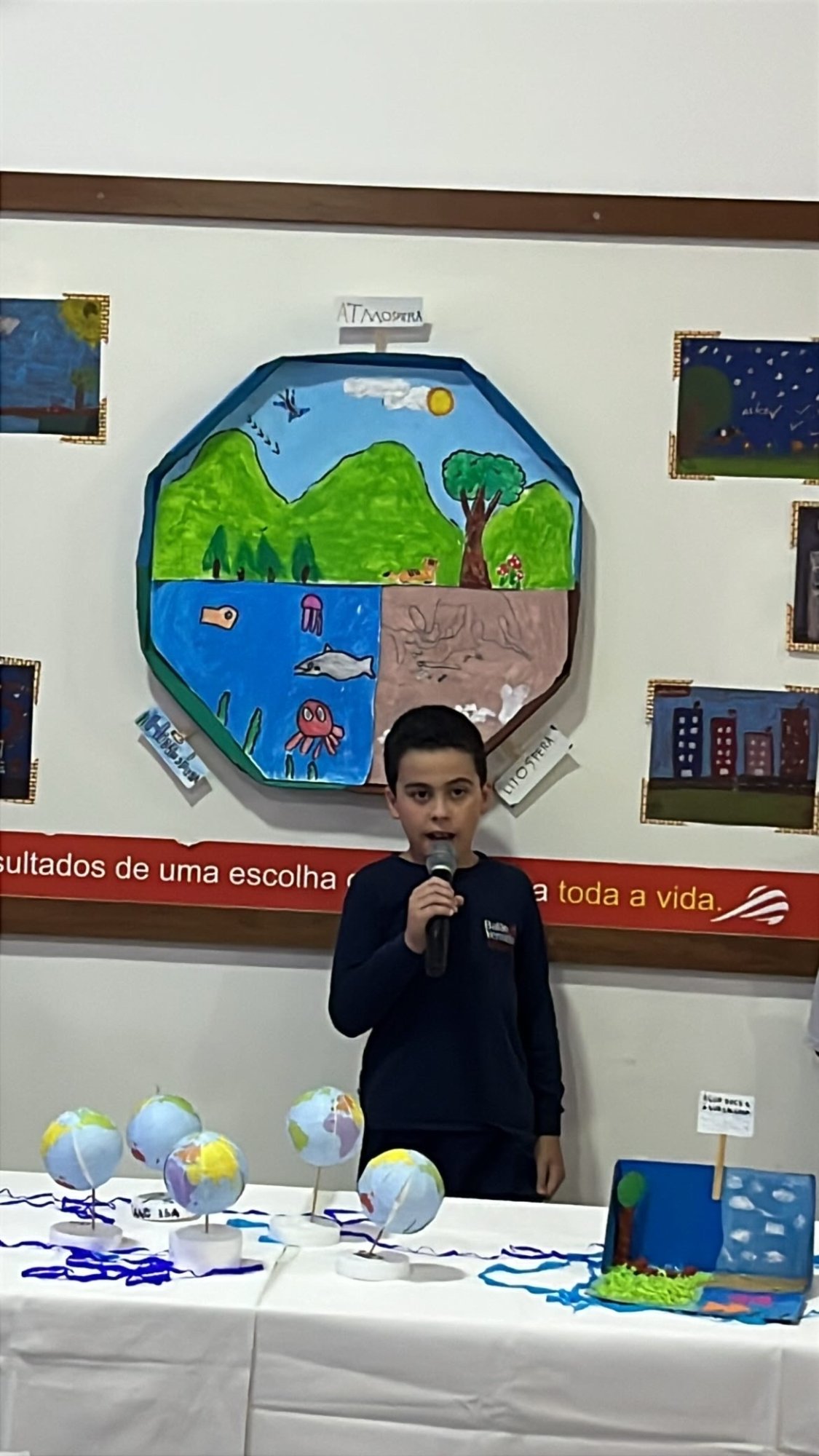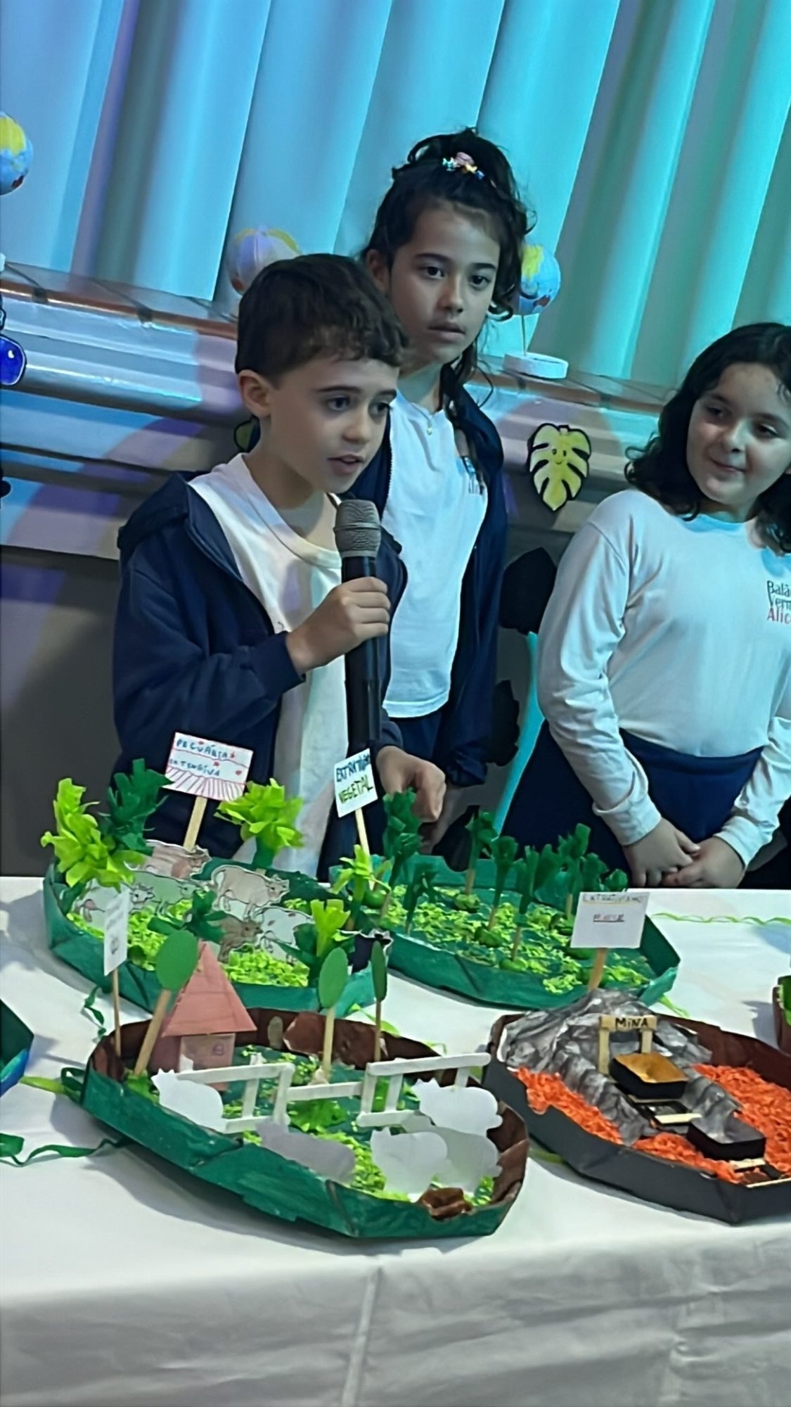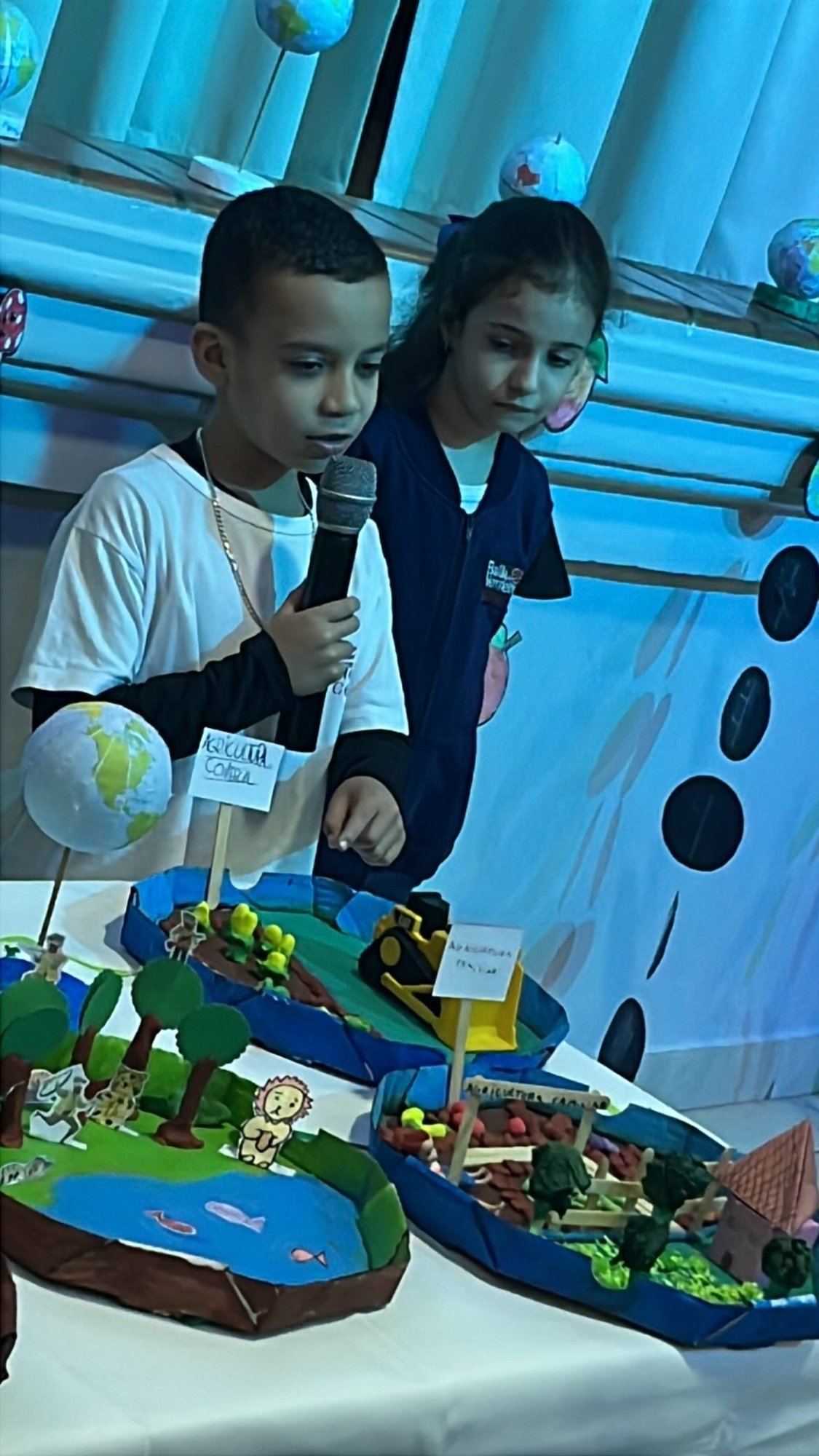 Os alunos do 3º ano apresentaram um trabalho sobre o Planeta Terra, desenvolvido de forma interdisciplinar. O projeto teve como tema principal a disciplina de Ciências, mas também integrou conteúdos de História, abordando o trabalho e o lazer no campo, e de Geografia, explorando aspectos do espaço urbano. Professora Elisângela Azevedo.