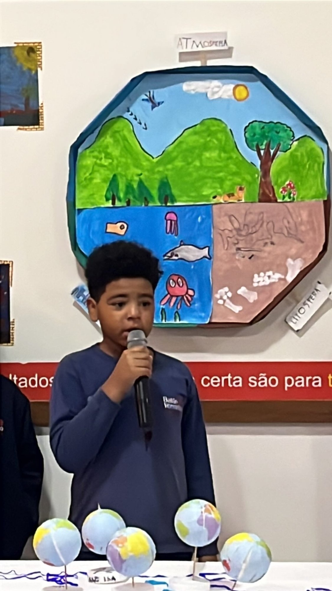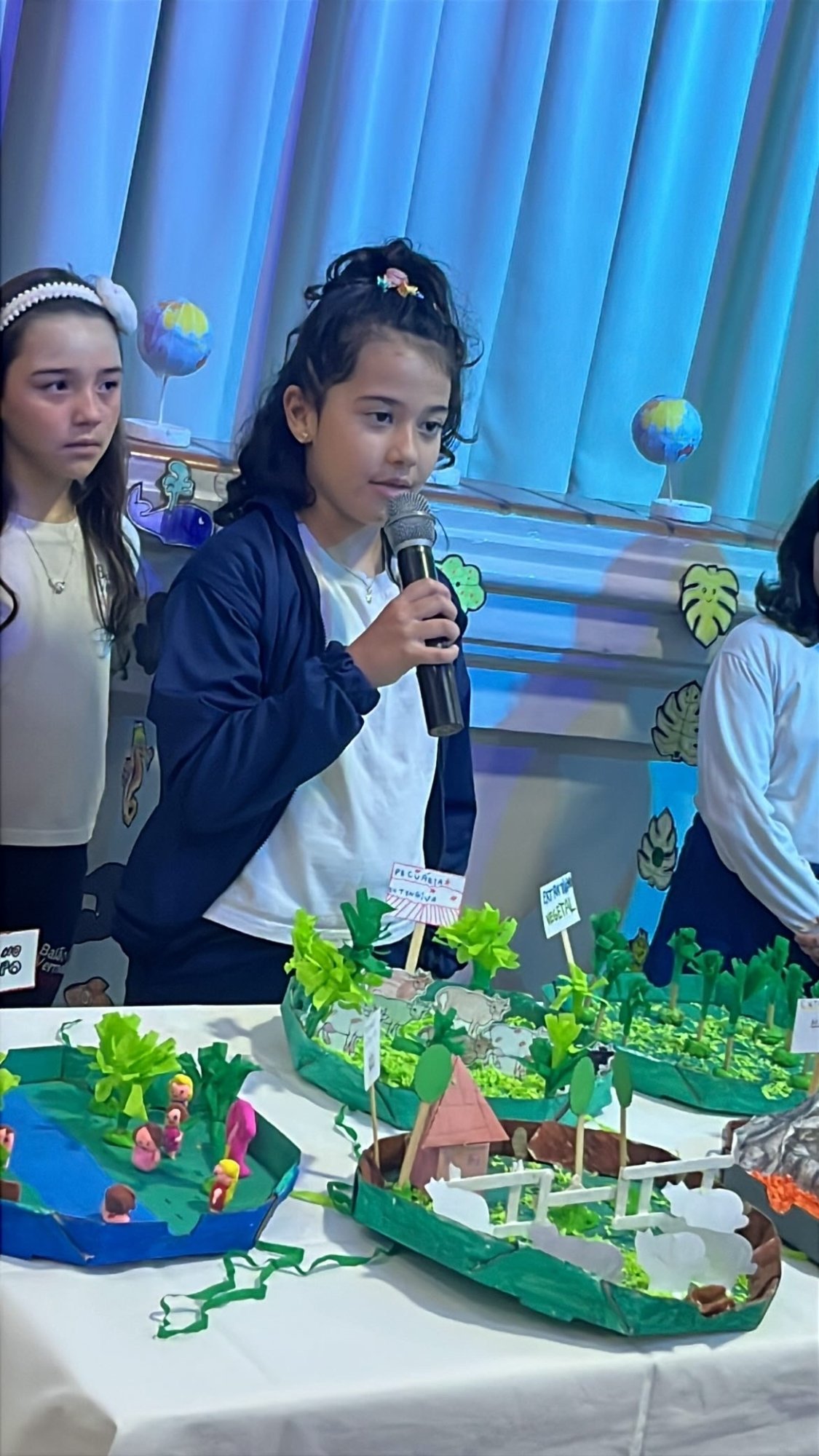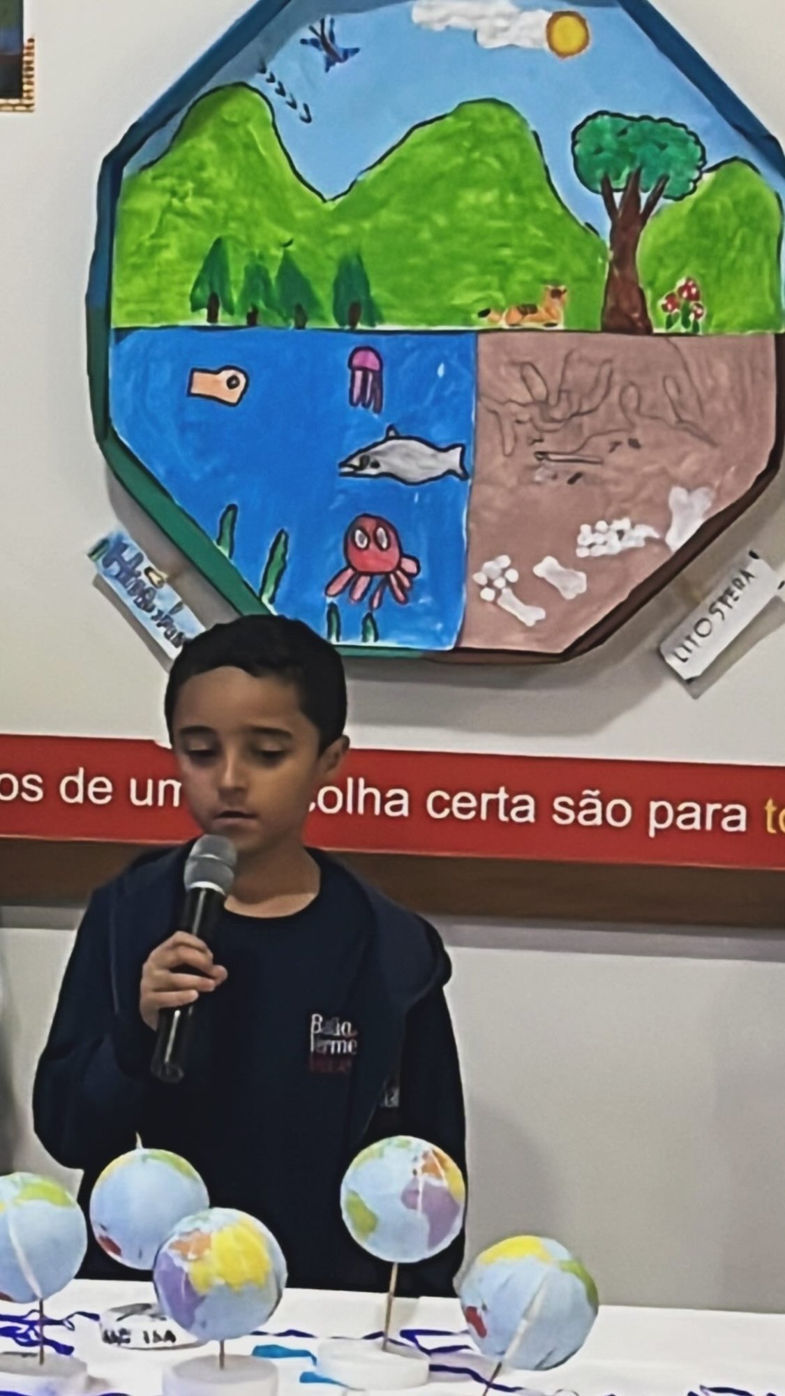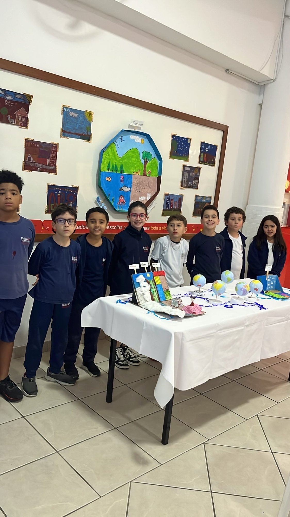 Os alunos do 3º ano apresentaram um trabalho sobre o Planeta Terra, desenvolvido de forma interdisciplinar. O projeto teve como tema principal a disciplina de Ciências, mas também integrou conteúdos de História, abordando o trabalho e o lazer no campo, e de Geografia, explorando aspectos do espaço urbano. Professora Elisângela Azevedo.