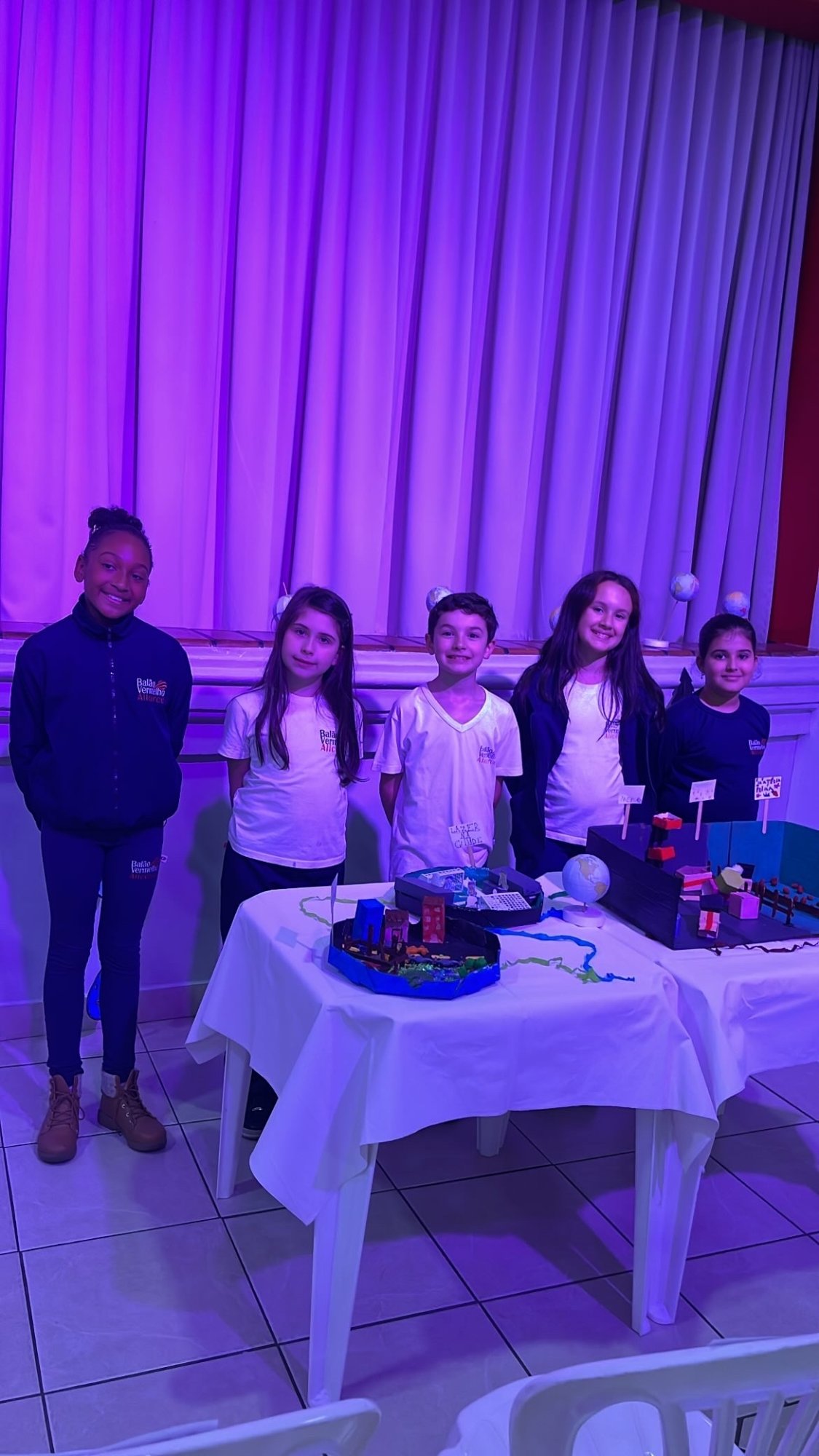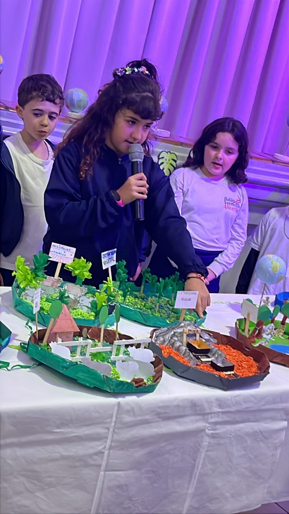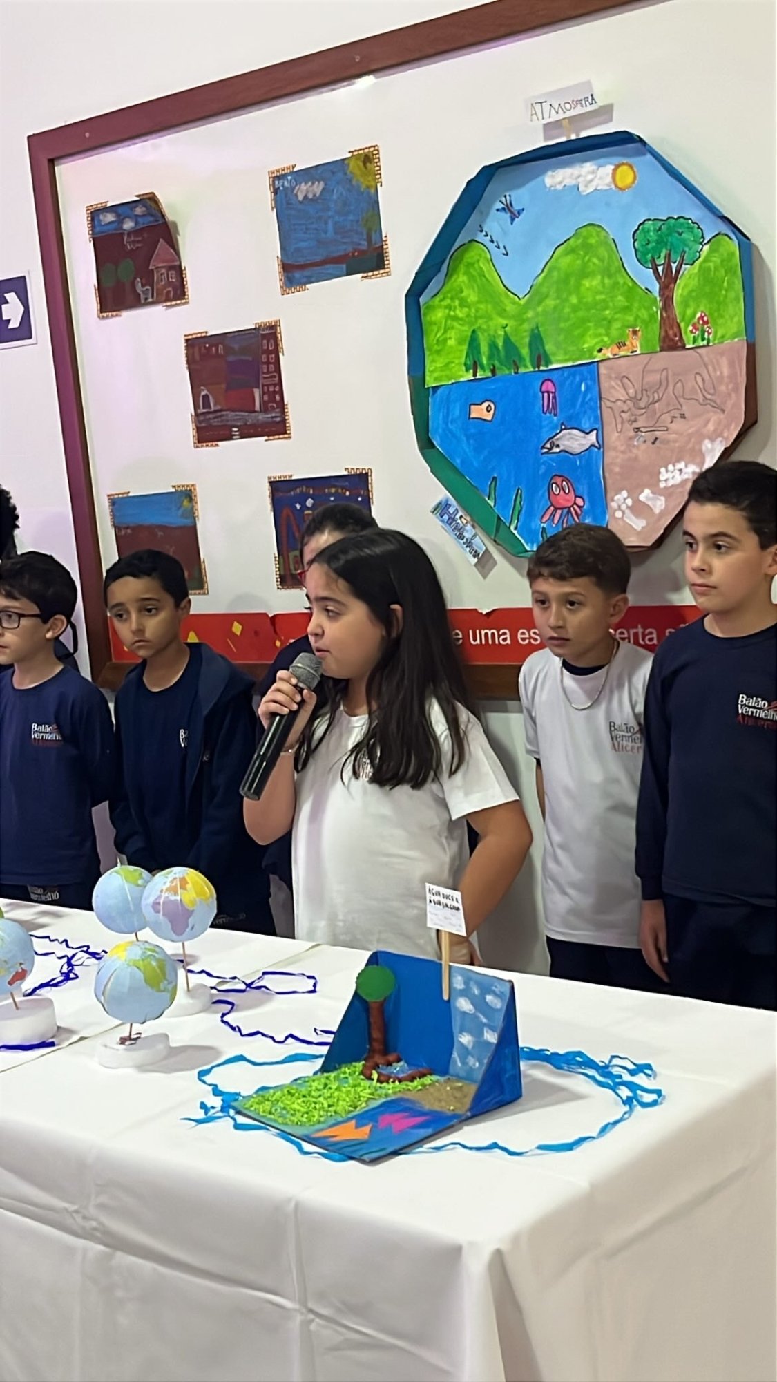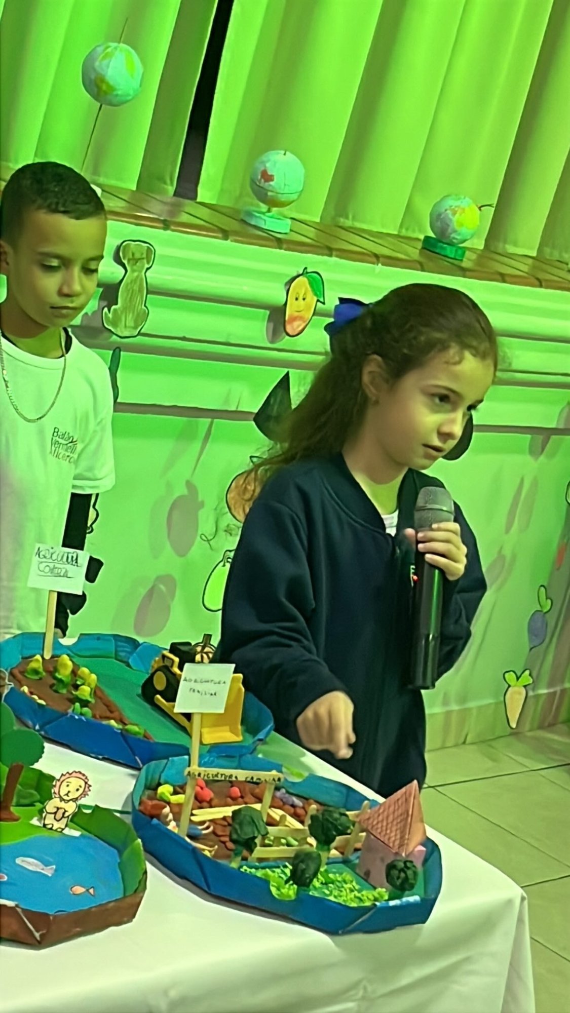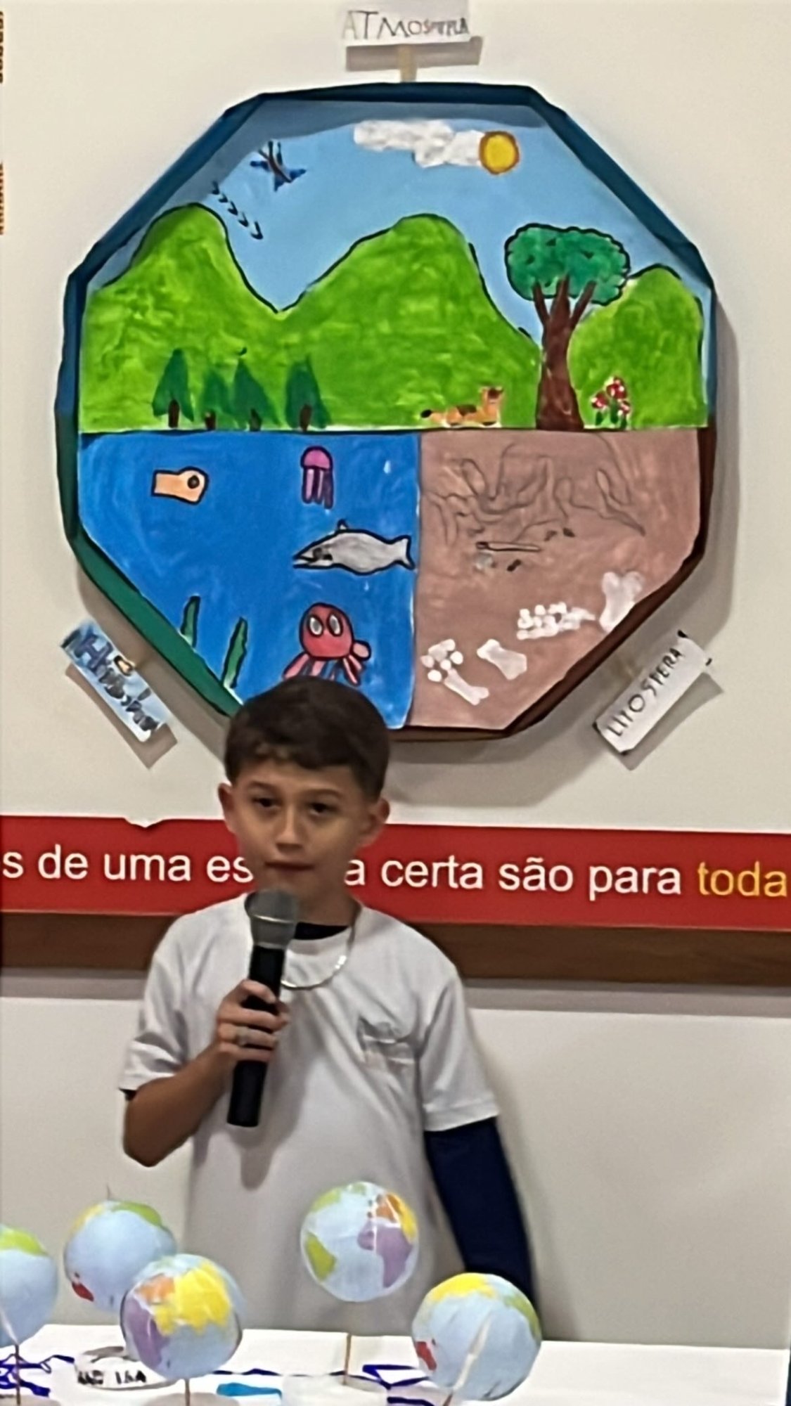 Os alunos do 3º ano apresentaram um trabalho sobre o Planeta Terra, desenvolvido de forma interdisciplinar. O projeto teve como tema principal a disciplina de Ciências, mas também integrou conteúdos de História, abordando o trabalho e o lazer no campo, e de Geografia, explorando aspectos do espaço urbano. Professora Elisângela Azevedo.