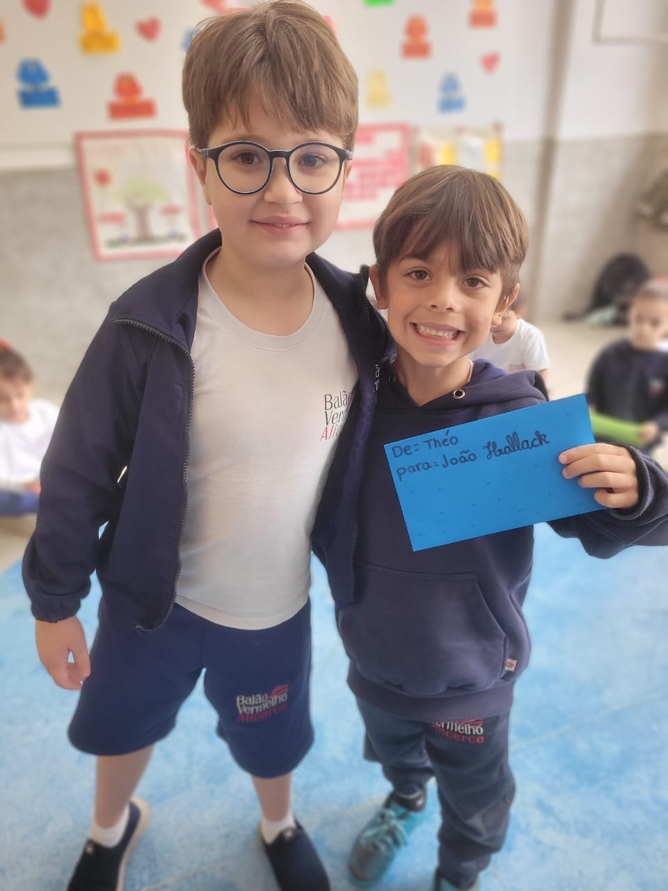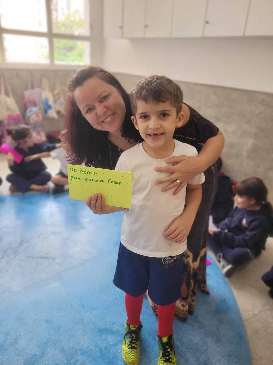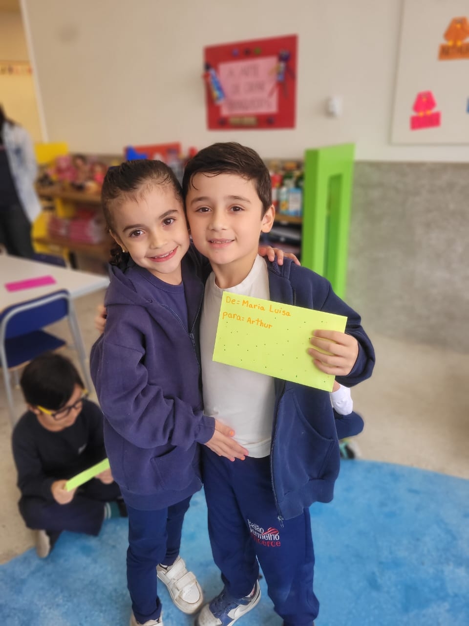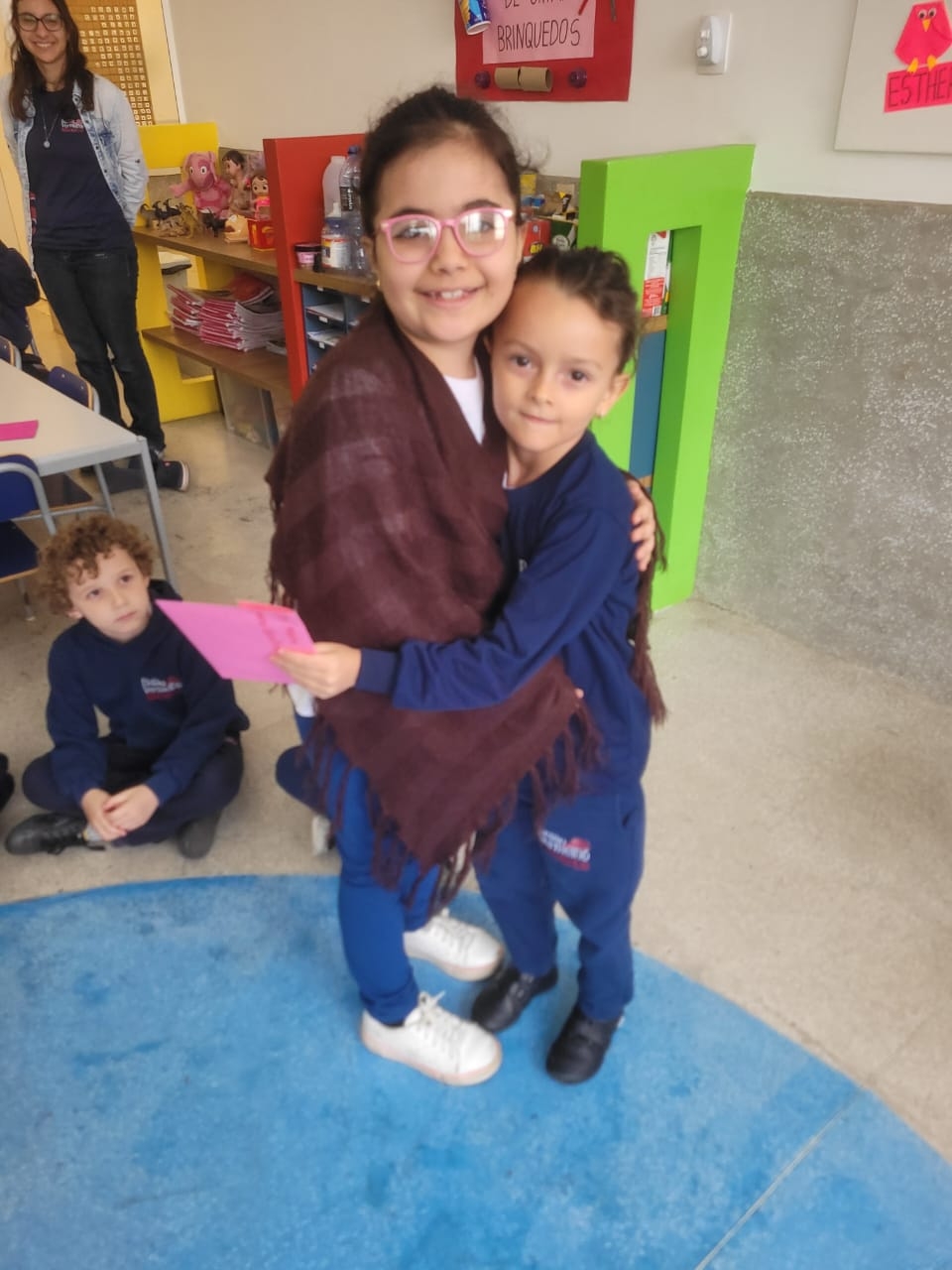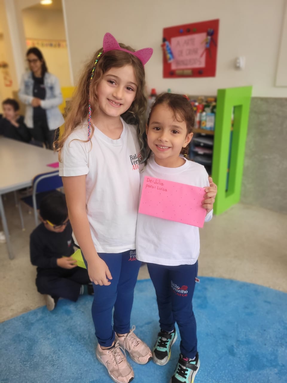 As crianças do Segundo Período receberam, com alegria, a visita da professora Júlia e dos alunos do Primeiro Ano. Durante o encontro, foram presenteadas com cartinhas carinhosas, nas quais receberam um convite especial para visitar a turma do Primeiro Ano ainda nesta semana.