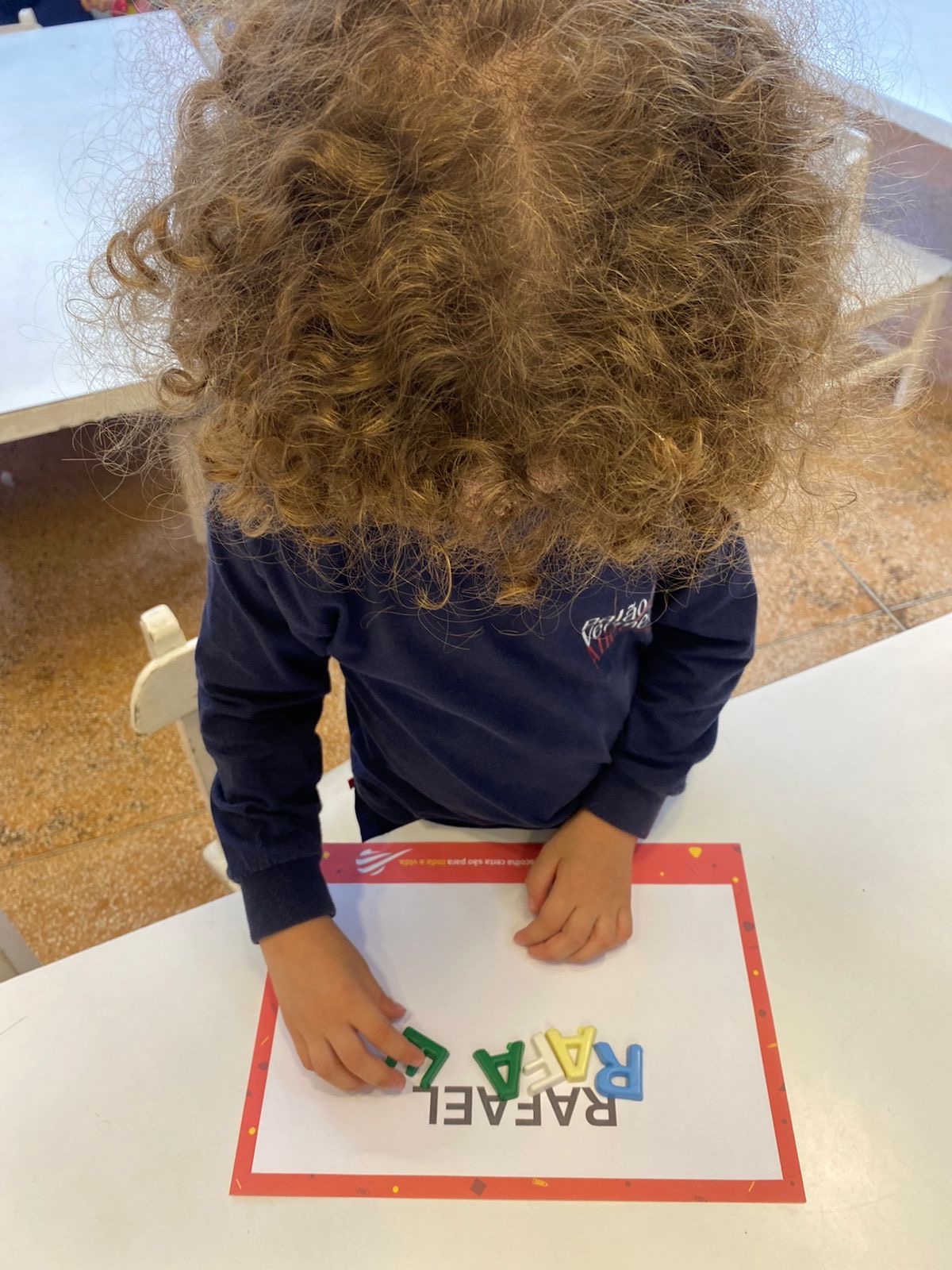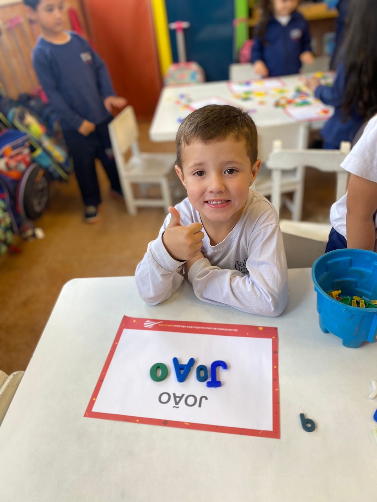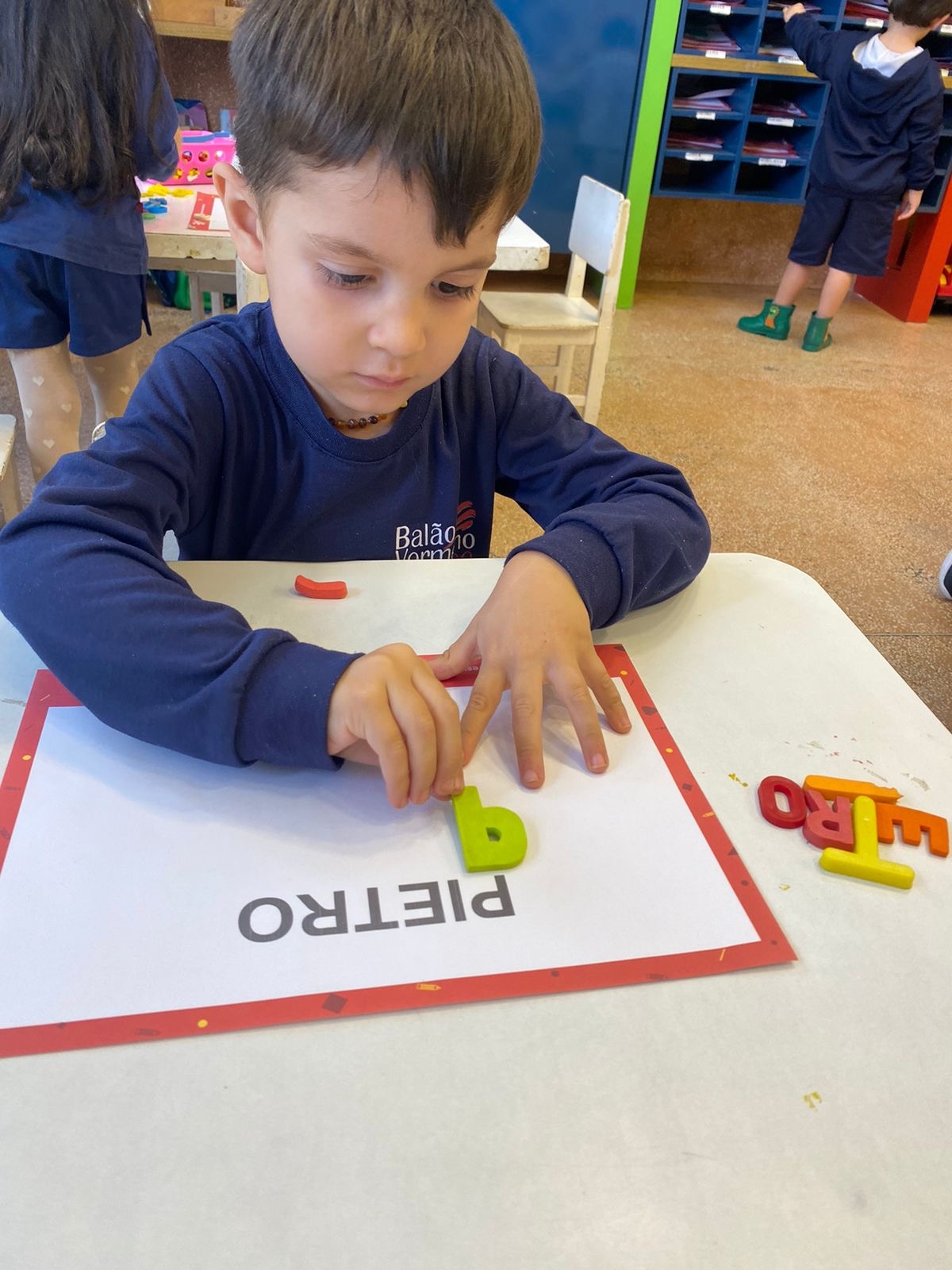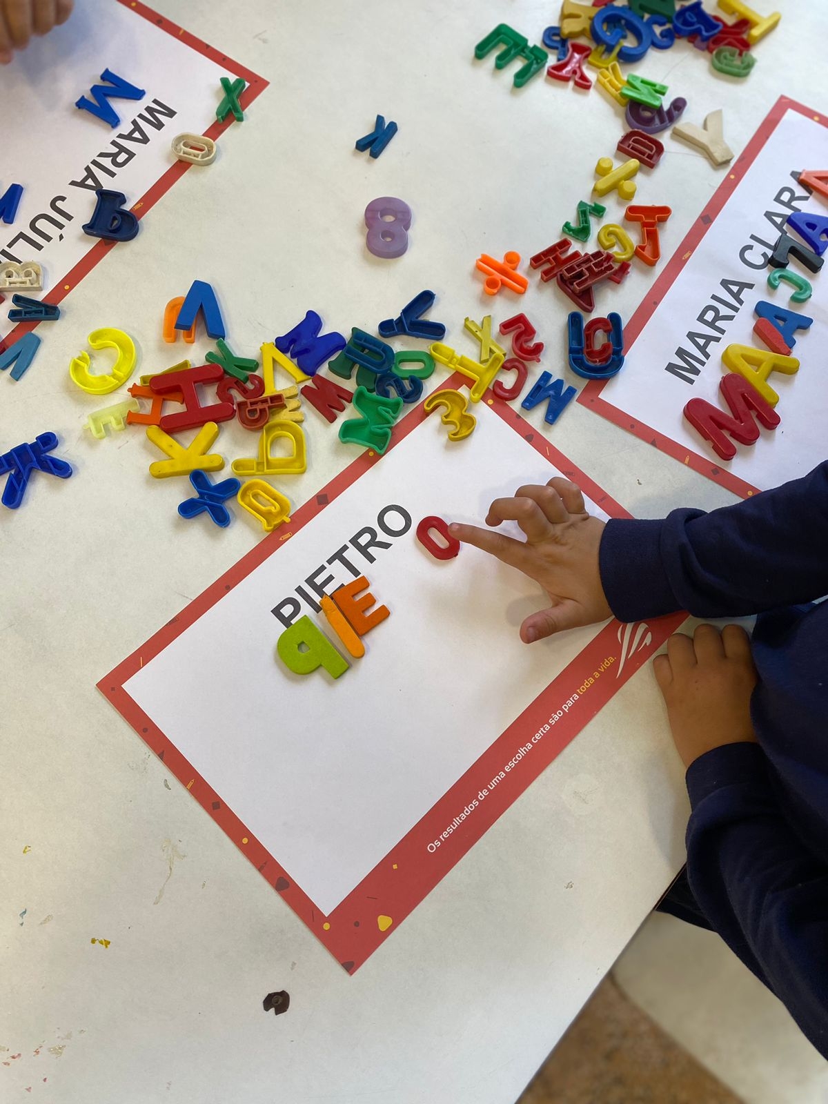Em um momento de concentração e descobertas, as crianças exploraram as letrinhas móveis para formar e reconhecer seus nomes. Essa proposta, além de divertida, estimula o pensamento simbólico, o reconhecimento das letras e o fortalecimento da identidade, aspectos essenciais no processo de alfabetização inicial.